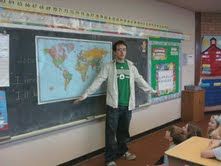 A week ago, Matthew came to my classroom to talk to the 2nd and 3rd graders about his trip. He actually held their attention for 2 hours! It was amazing! Even though Matthew talked about what he saw and did in each country, he emphasized how lucky he is for meeting so many nice people around the world and how great it was to learn about their culture. It was truly a humbling experience for him. It changed him forever. Here’s a picture [from my cell phone] of Matthew in my classroom.