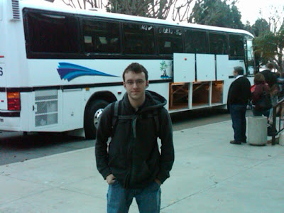 My husband took this photo of my son Matthew this morning in San Diego, CA. This bus was about to bring him to the MV Explorer, the ship that will take him on a voyage around the world. The parents were not allowed to bring their children to the ship because they had to board the ship in Mexico. It will depart later today and head for Hawaii. [Cue the ukulele music!]