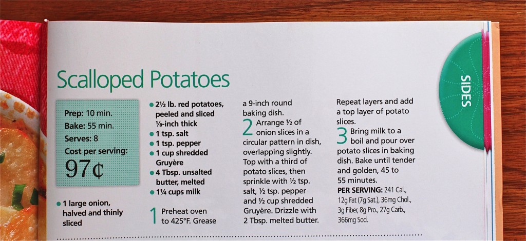 I made the Scalloped Potatoes on page 155. It was delicious! I think we’re big eaters…in other words…our portion sizes are too big! We got 4 servings out of this instead of 8. I like the recipe though and would gladly make it again!