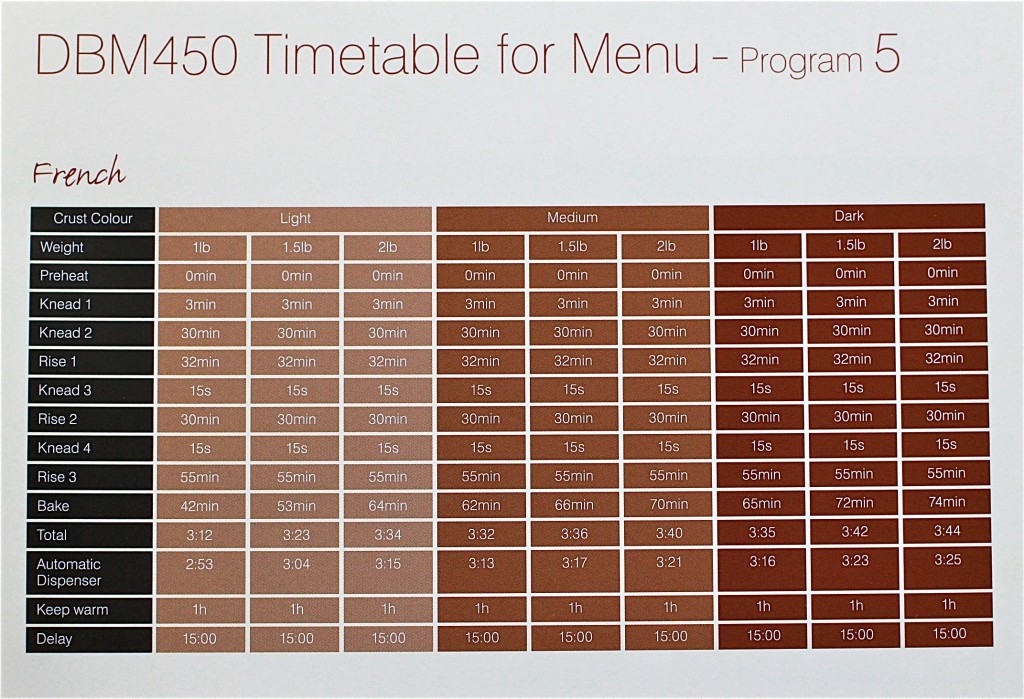 The French Bread is made using the Program 5 setting. You can choose 1, 1.5, or the 2 lb. size and you can select light, medium, or dark crust. My bread was set on 2 lbs. with a medium crust. It came out nice and crusty on the outside and soft on the inside! We loved it!