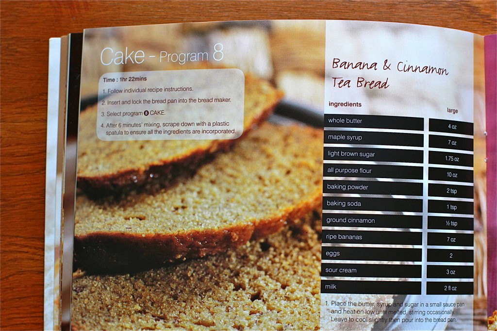 I never made a sweet bread in the bread maker before, so I made the Banana & Cinnamon Tea Bread from the manual. I’m crazy about this bread! It’s moist and dense and totally yummy!