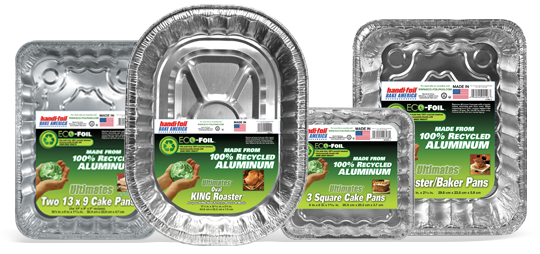 Eco-Foil offers a variety of products to choose from, including roasters, baking pans, and a broad line of favorites ranging from King Roaster® with handles (a Handi-Foil exclusive) to the Cook-N-Carry® line of pans with lids. All made from 100% recycled materials — even the plastic lids. Eco-Foil is the perfect eco-friendly choice for all your baking, roasting or grilling needs —and a great way for you to save natural resources and protect our earth, one pan at a time.