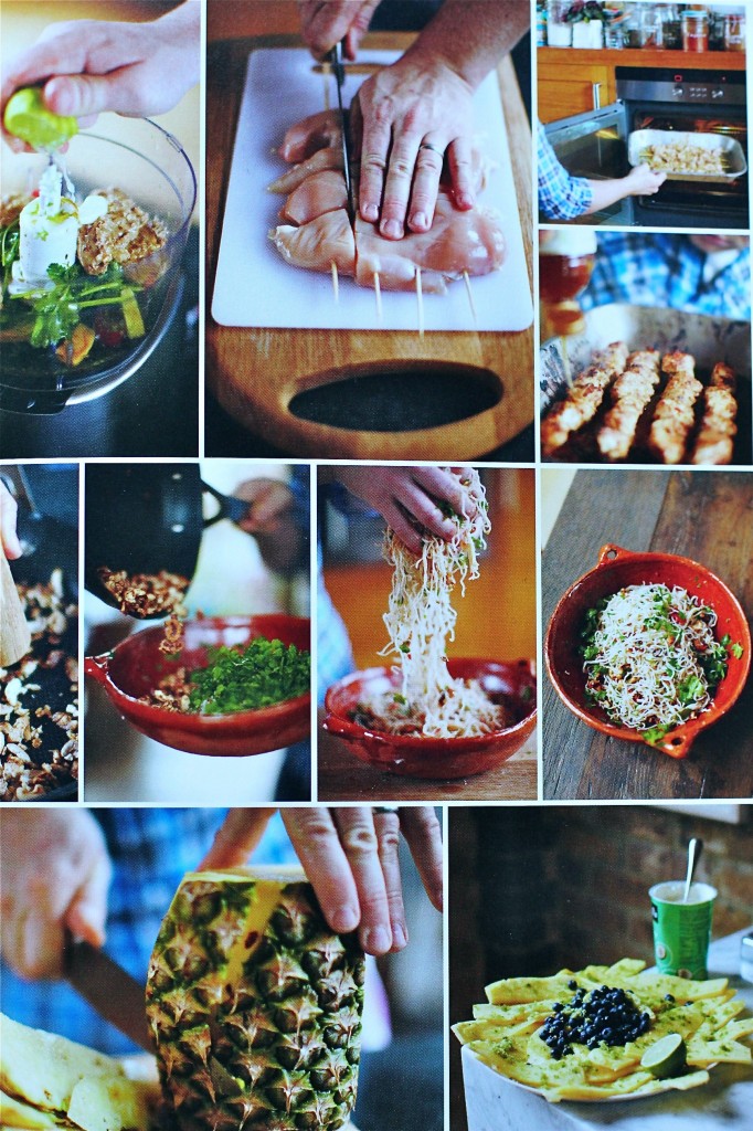 On this page, there is Chicken Skewers, Amazing Satay Sauce, Fiery Noodle Salad, and Fruit and Mint Sugar.
