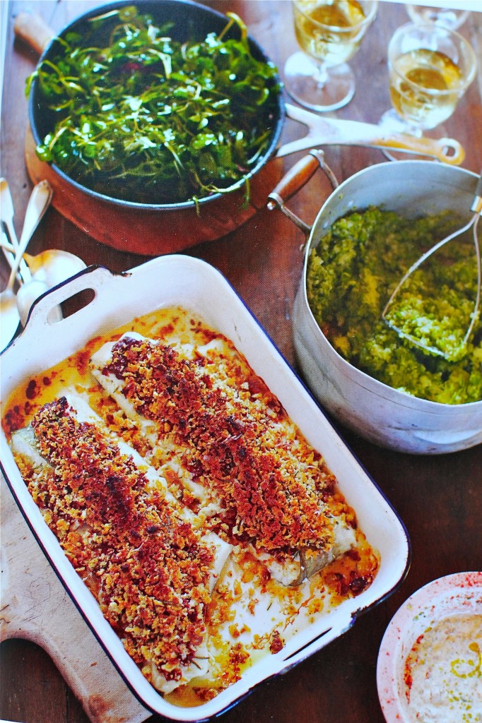 This group of recipes includes Tasty Crusted Cod, My Mashed Peas, Tartar Sauce, and Warm Garden Salad.