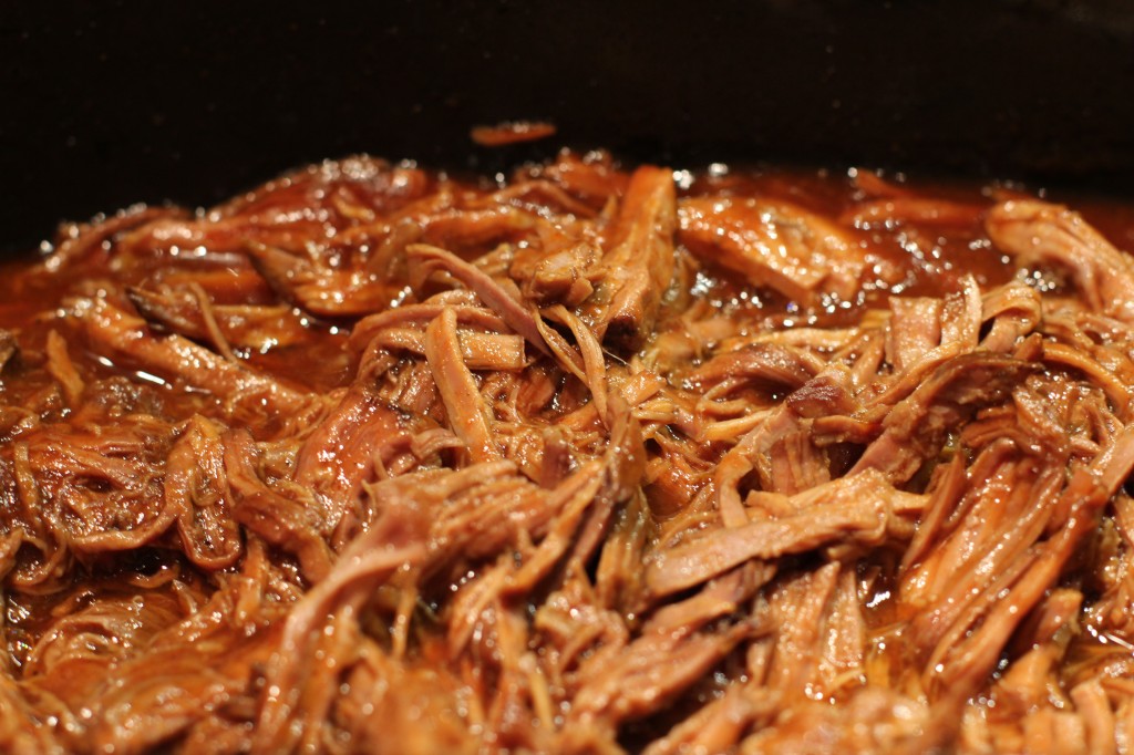 4. When the beef is done, place the beef on a plate and shred it with 2 forks. Return the beef to the sauce and mix well. Serve on a hamburger bun.