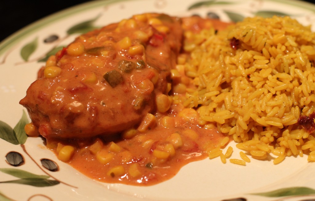 3. When the chicken is done, transfer the chicken to a plate. Combine the corn starch and water in a tiny bowl and stir into the salsa mixture. Add the sour cream and the corn to the sauce and mix well. Return the chicken to the pot and heat for a few minutes.