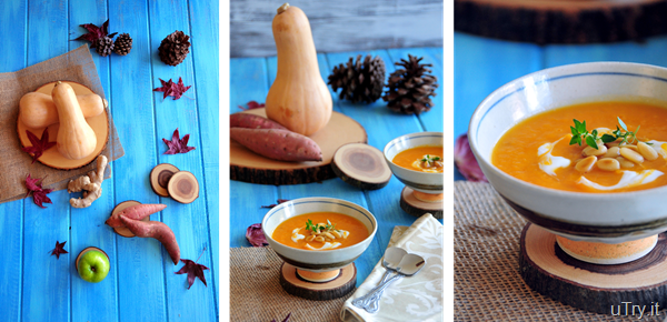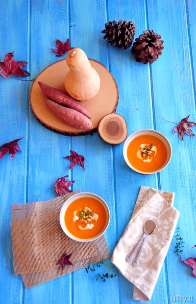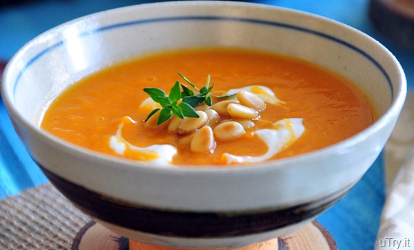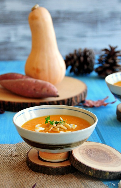 The smoky flavor in this recipe came from a chipotle pepper that I added. It adds a lot of smokiness and some heat to the soup. If you’re serving the soup for younger kids and only want the smokiness but not the heat, you can definitely replace the chipotle with a tablespoon of smoke paprika, which only have smoky flavor but not the heat. Besides Butternut squash in this recipe, I added a little red yam for sweetness to balance out the heat and smoky flavor. I also added a little bit of freshly grated ginger for earthiness to round out the overall flavor. When ready to serve, put a dollop of crème fraîche for creaminess and a teaspoon or so of toasted pine nuts for some crunch. You can serve this soup as a side dish or bigger portion with toasts or baguette as a meal. Either way, your tummy and family will thank you. ![]()