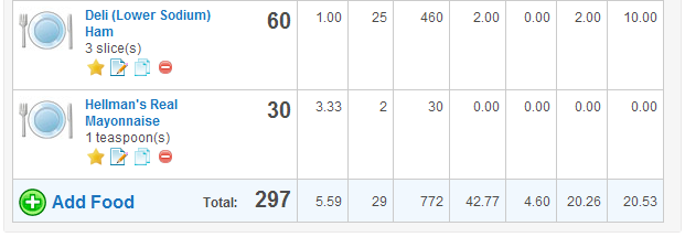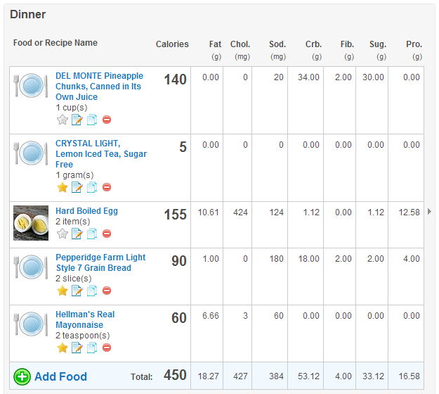 See how it evaluates the nutrition in today’s total? It’s a handy little tool! I don’t normally eat an egg salad sandwich for dinner. I usually have meat/potatoes/vegetable, but I just picked this particular day to show you what it’s like. You can use the program’s data base of food or add your own foods that you eat by typing in the nutritional data from your food labels.
