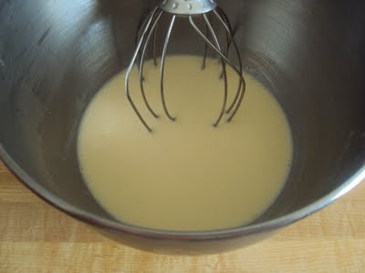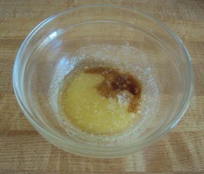 While the cake is cooling, melt butter in microwave then add vanilla.