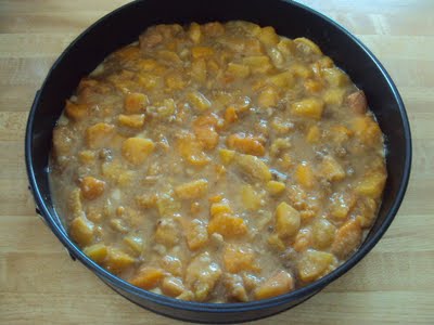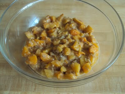 Place diced peaches into a bowl and stir in the melted butter, brown sugar, cinnamon, nutmeg, and flour.